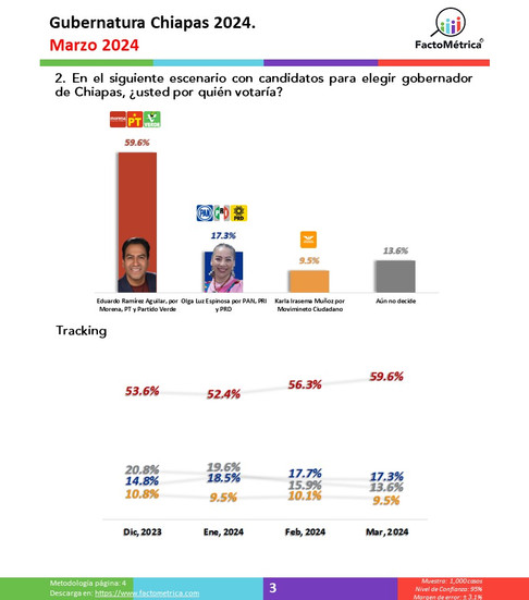Gubernatura Chiapas 2024, 30 marzo.Gerardo Leal30 mar 20241 Min. de lecturaPreferencia por coaliciones, partidos y candidatos.Gubernatura Chiapas 2024 - Marzo 2024.pdfDescargar PDF • 616KB