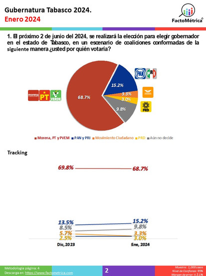La encuesta de enero de 2024 para la gubernatura de Tabasco muestra un dominio de Morena-PT-PVEM con el 68.7% de la intención de voto, seguido por PAN y PRI con el 15.2%, Movimiento Ciudadano con el 3.3%, y PRD con el 3.0%. Un 9.8% aún no decide. En un escenario con candidatos, Javier May Rodríguez de Morena-PT-PVEM lidera con el 70.6%, Lorena Beaurregard de PAN y PRI sigue con el 12.4%, y Juan Manuel Fócil Pérez del PRD tiene el 5.7%. La muestra fue de 1000 casos, con un nivel de confianza del 95% y un margen de error de ±3.1%.