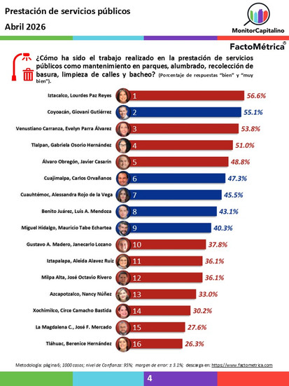 En servicios públicos, destacan alcaldías como Iztacalco (56.6%) y Coyoacán (55.1%).