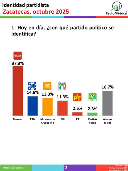 🔹 Morena mantiene la mayor identidad partidista con 37.3%, seguida por PAN (14.6%) y Movimiento Ciudadano (13.3%).